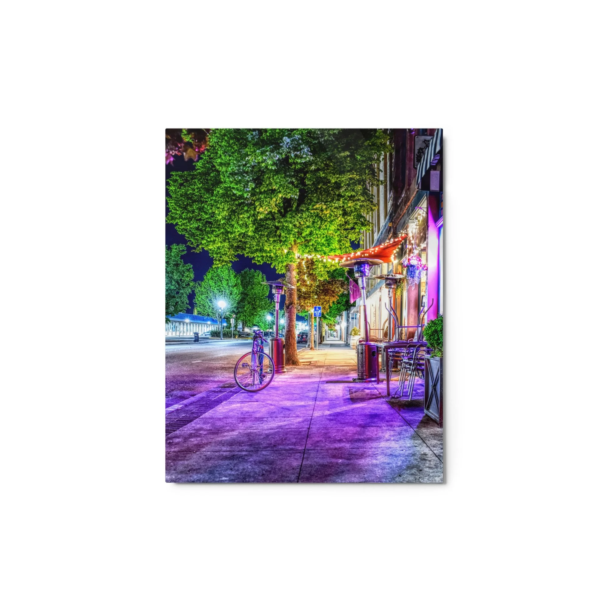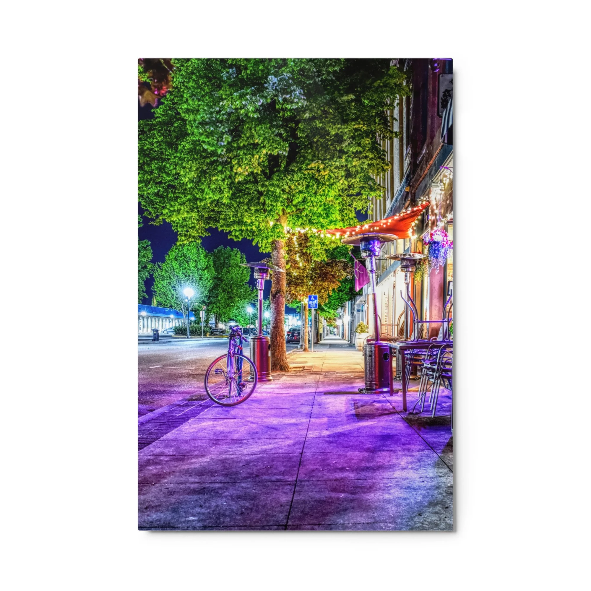 A vibrant, vertical night photograph of a sidewalk in downtown Grants Pass, Oregon, at the corner of 4th and G Street. The scene is bathed in a surreal and saturated violet and magenta light emanating from nearby shop windows. In the foreground, a lone bicycle is parked against a post, its wheels catching the purple glow. Tall, lush green deciduous trees line the sidewalk, their leaves brilliantly illuminated by streetlights and interior building lights. On the right, an outdoor seating area features stacked metal chairs, a wooden table, and tall patio heaters under a red awning decorated with string lights. The wet-looking concrete sidewalk leads the eye into the distance toward a soft-focus streetscape. The high-contrast lighting and intense color palette create a cinematic, award-winning atmosphere that highlights the urban beauty of the historic district.