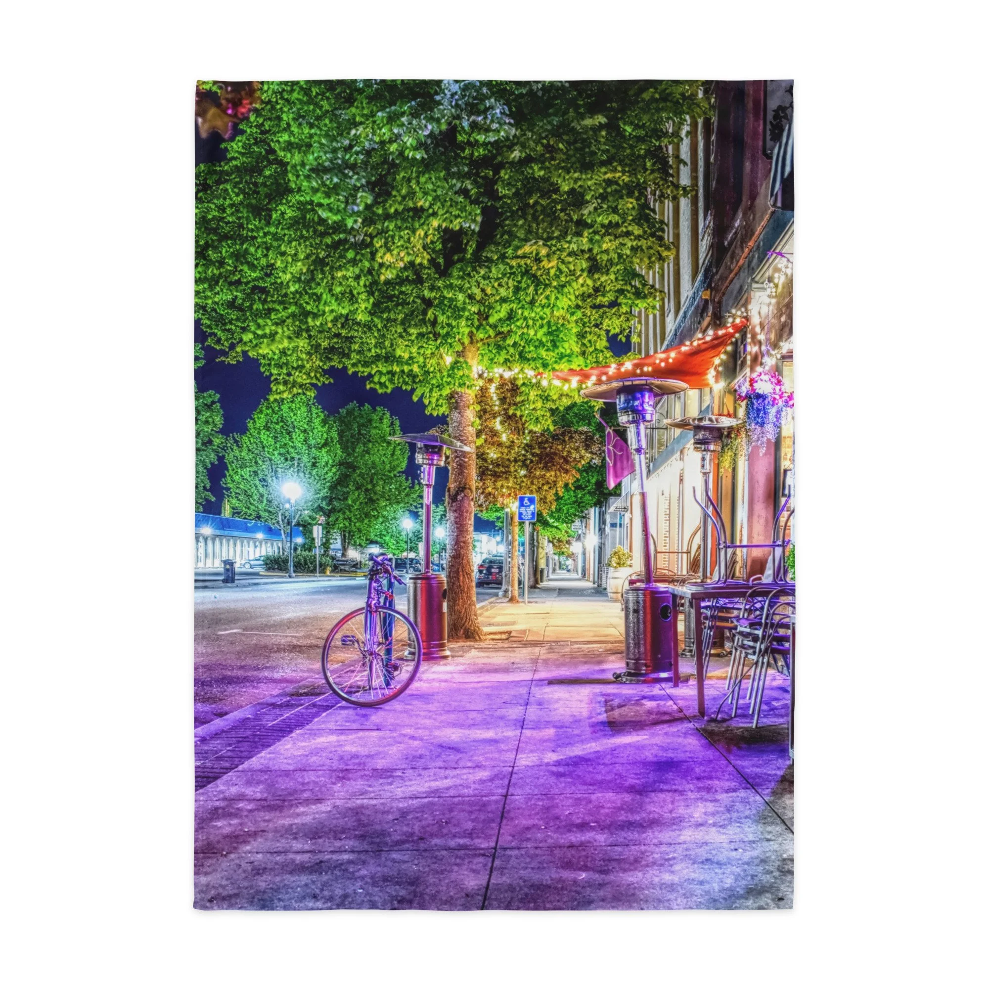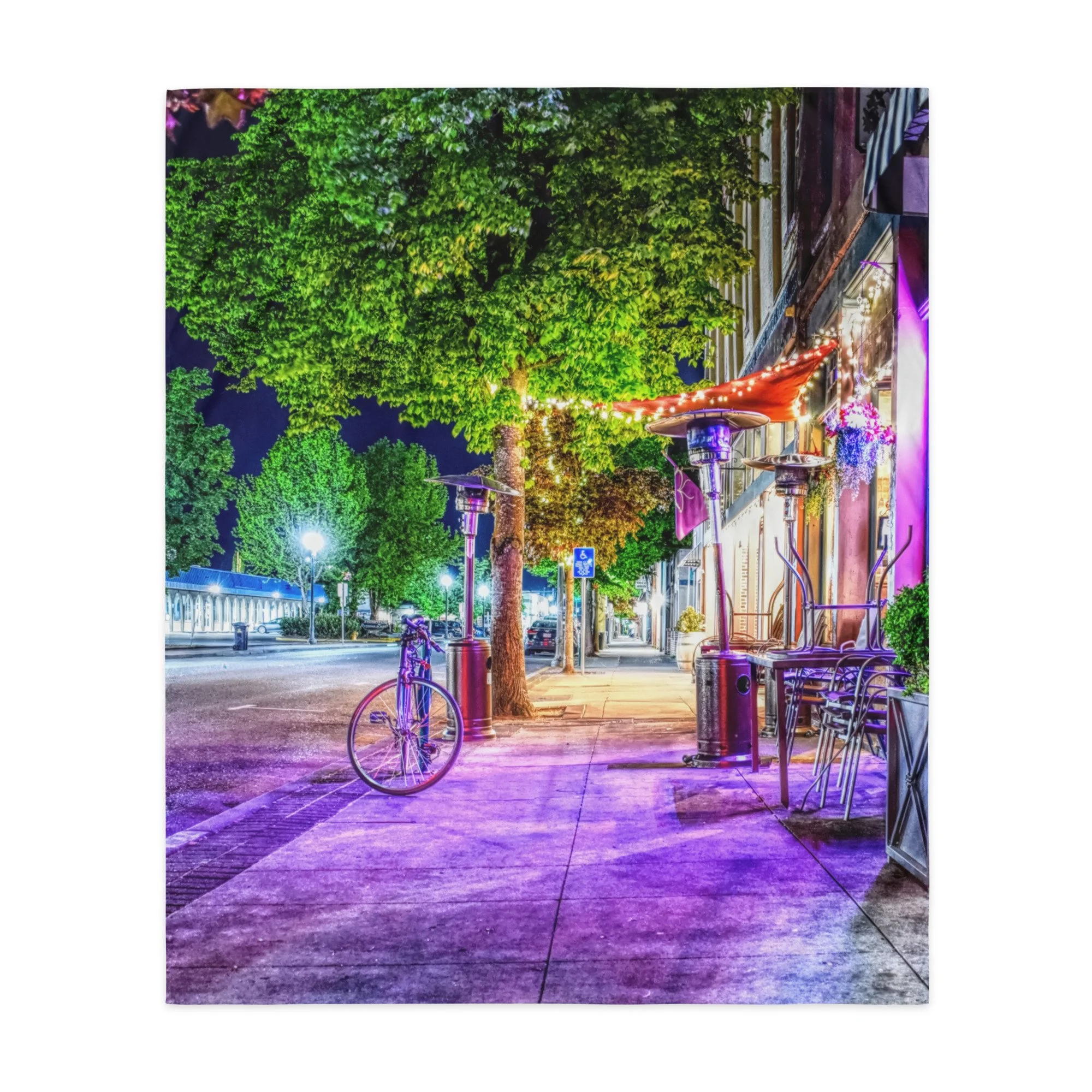 A vibrant, vertical night photograph of a sidewalk in downtown Grants Pass, Oregon, at the corner of 4th and G Street. The scene is bathed in a surreal and saturated violet and magenta light emanating from nearby shop windows. In the foreground, a lone bicycle is parked against a post, its wheels catching the purple glow. Tall, lush green deciduous trees line the sidewalk, their leaves brilliantly illuminated by streetlights and interior building lights. On the right, an outdoor seating area features stacked metal chairs, a wooden table, and tall patio heaters under a red awning decorated with string lights. The wet-looking concrete sidewalk leads the eye into the distance toward a soft-focus streetscape. The high-contrast lighting and intense color palette create a cinematic, award-winning atmosphere that highlights the urban beauty of the historic district.
