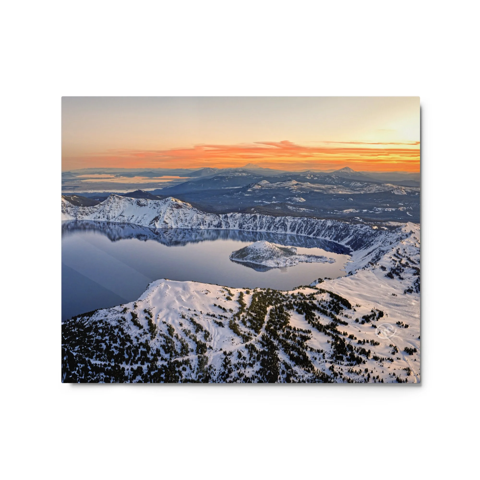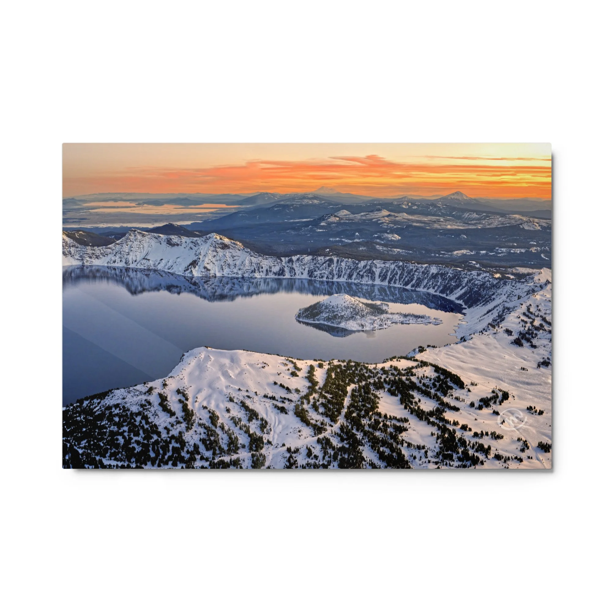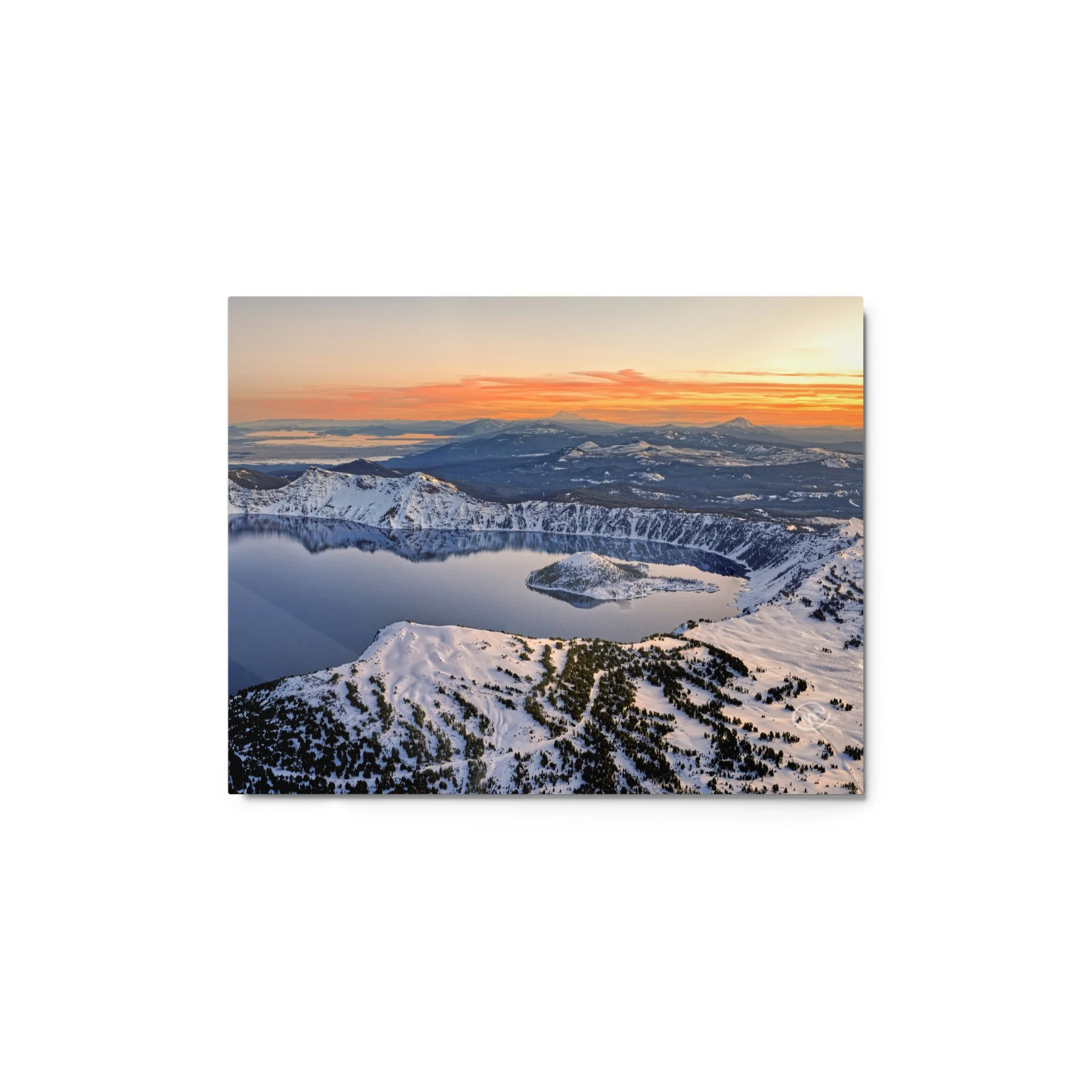 A spectacular, high-altitude aerial photograph of Crater Lake National Park during a winter sunset. In the foreground, the deep blue, mirrored surface of the lake is partially visible, with the snow-covered Wizard Island sitting near the steep, jagged crater rim. The entire caldera and the surrounding rolling hills are blanketed in a thick, pristine layer of white snow. In the far distance, the silhouettes of Mount McLoughlin and the massive, snow-capped Mount Shasta rise above a series of dark blue mountain ridges. The sky is a breathtaking gradient of soft peach, vibrant orange, and pale gold at the horizon, transitioning into a clear, cool blue above. The lighting emphasizes the vast, prehistoric scale of the Cascade Range and the tranquil beauty of Oregon's only National Park.