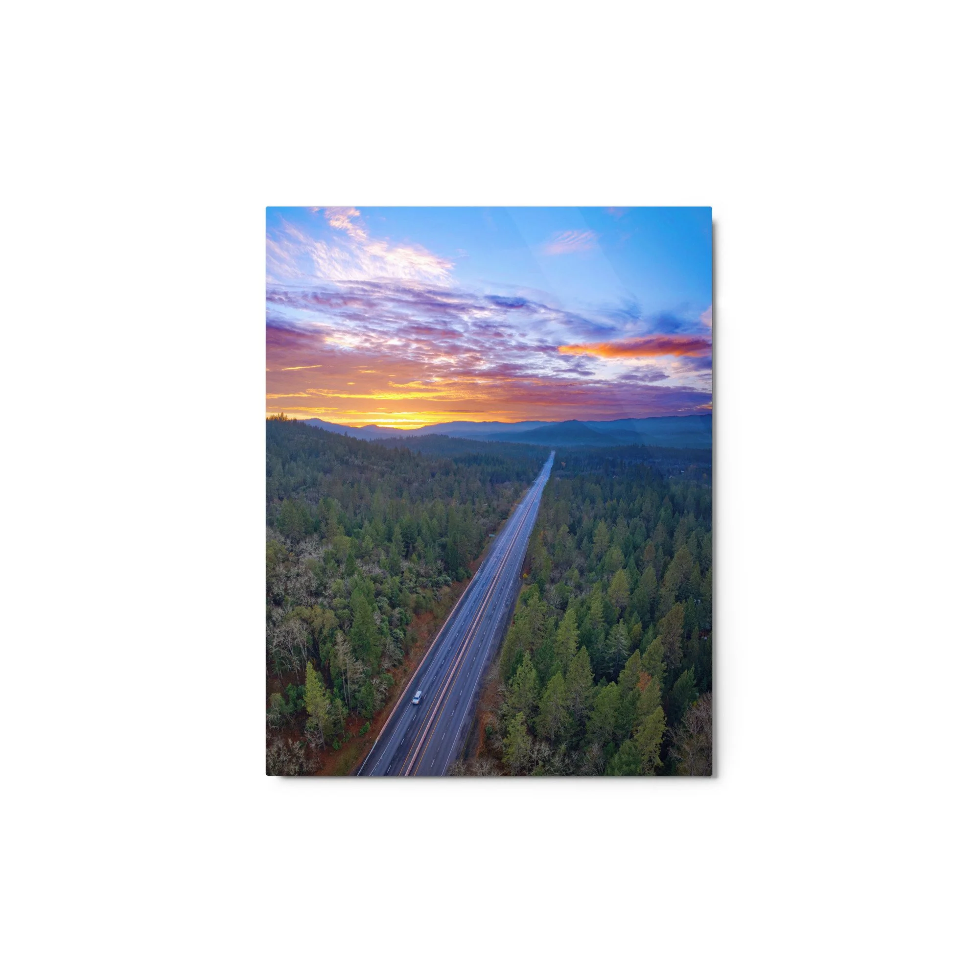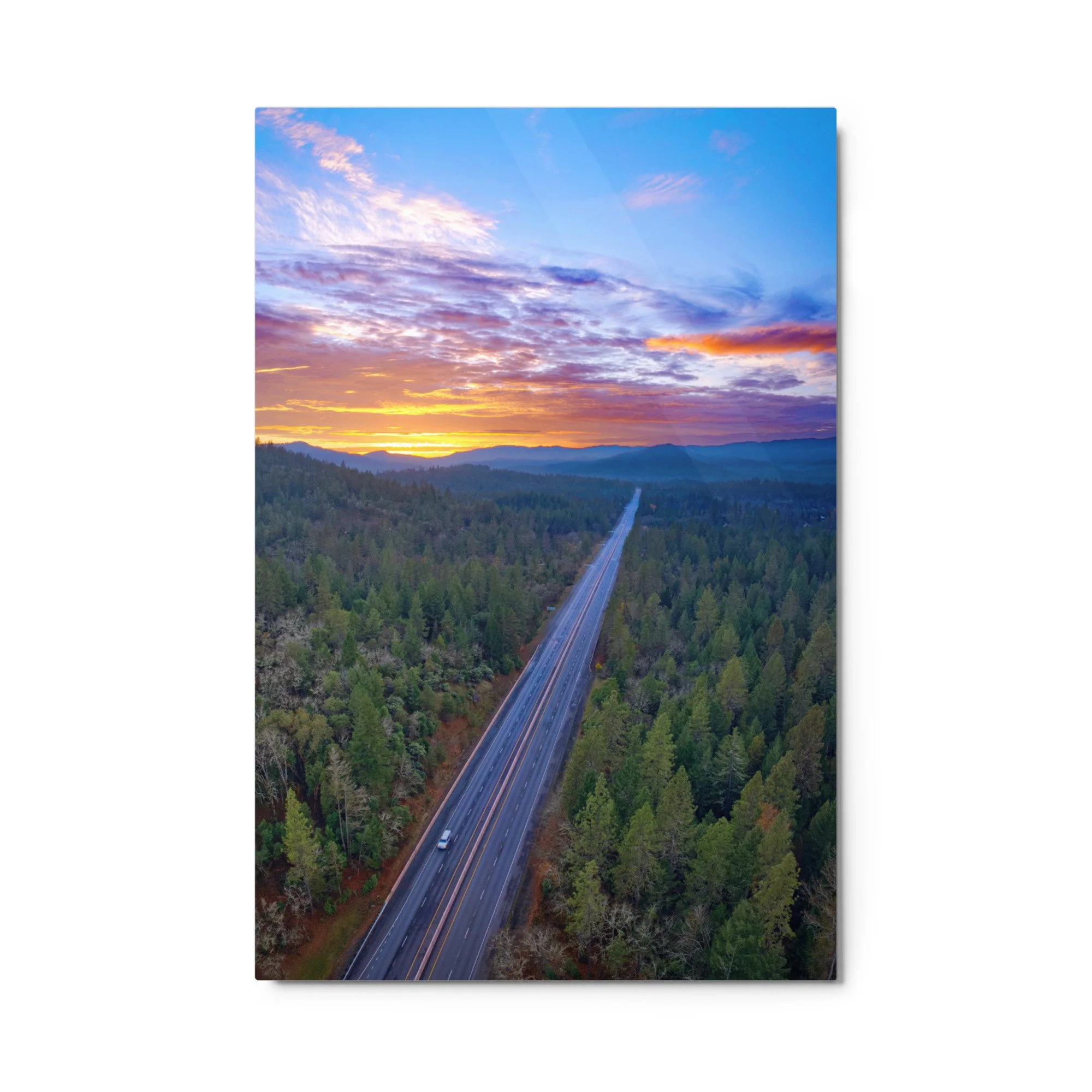 A high-angle, vertical aerial photograph looking down a long, straight section of the Redwood Highway (US-199) near Grants Pass, Oregon. The two-lane highway, marked with white and yellow lines, cuts a sharp diagonal through a dense, expansive forest of green coniferous trees. A single white vehicle is visible in the lower-left portion of the road. The forest floor shows hints of autumn brown beneath the heavy evergreen canopy. In the background, rolling blue mountain ridges recede into the distance under a spectacular sunset sky. The clouds are a complex layer of deep purple, vibrant orange, and soft pink, with a bright yellow light breaking through at the horizon. The overall lighting is dramatic and serene, emphasizing the vast scale of the Oregon wilderness and the linear path of the road through it.